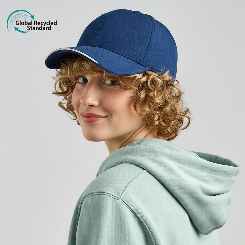 en tejido de poliéster reciclado con un filo de contraste en la visera