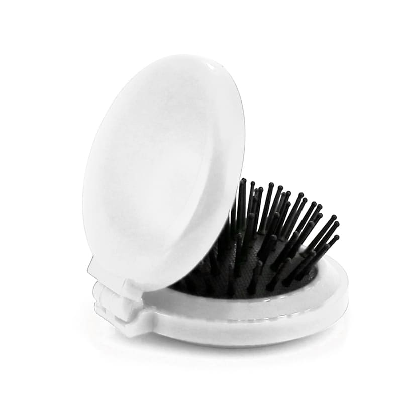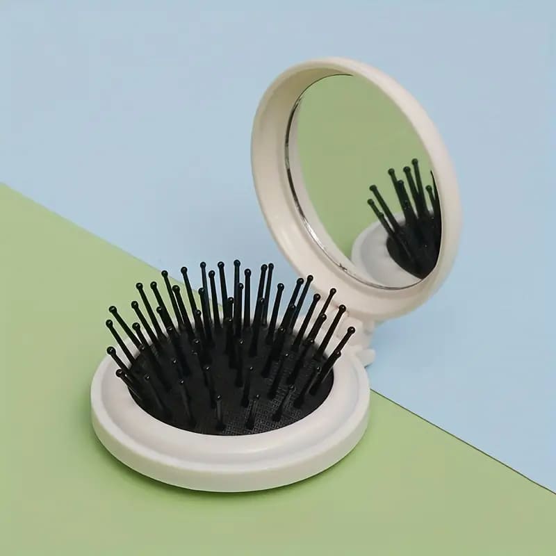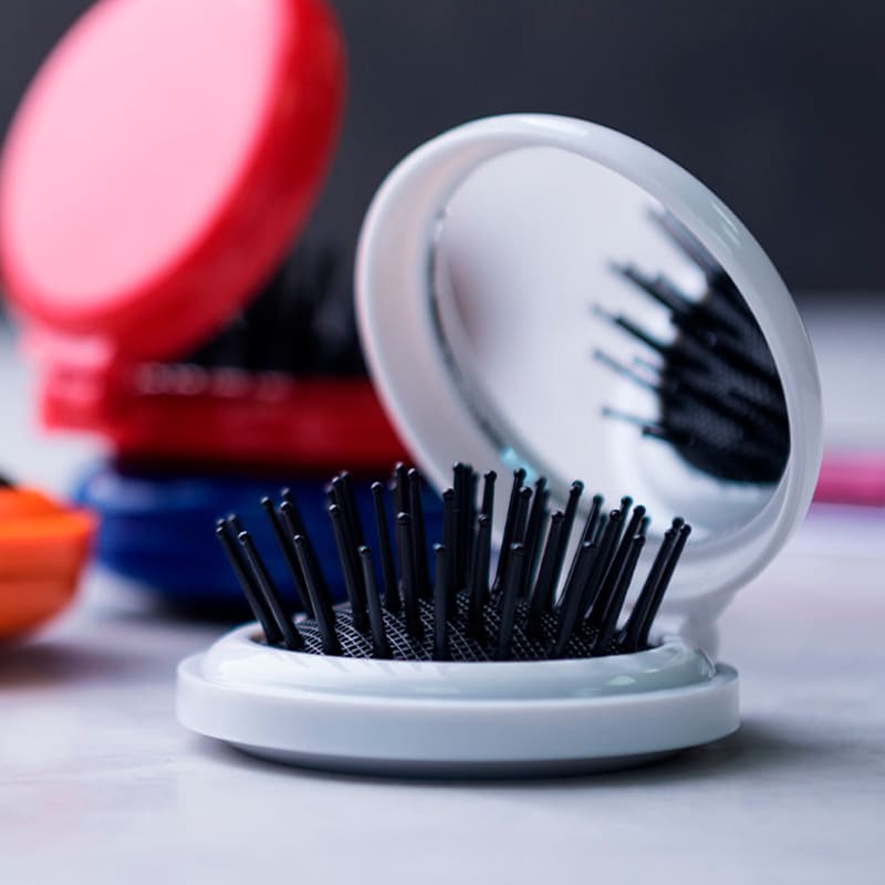 Cepillo plegable con espejo en variada gama de vivos colores.