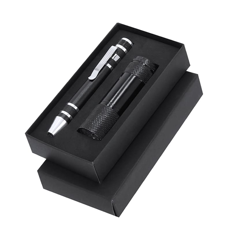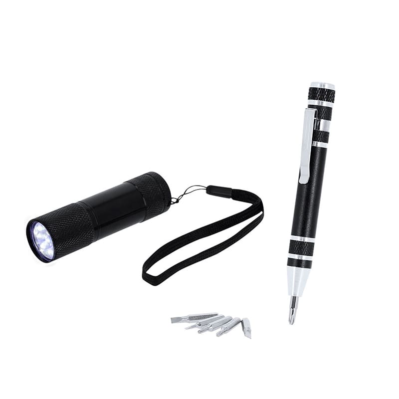 Set de Herramientas Multifuncional con Linterna y Destornillador en aluminio. Incluye: