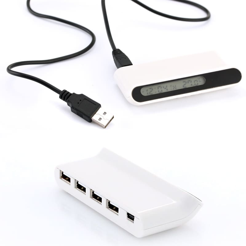 4 Puertos USB, con reloj digital y medidor de temperatura.
